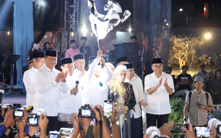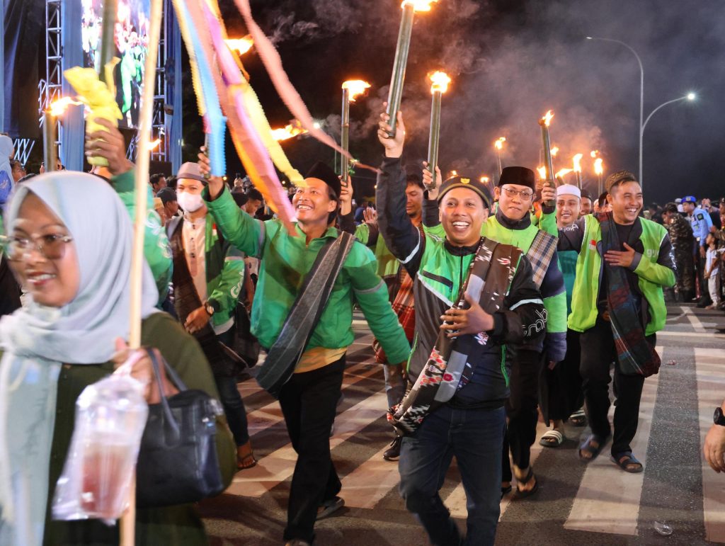 Ribuan peserta yang berasal dari berbagai kalangan, mulai dari remaja Masjid, pelajar, hingga komunitas masyarakat dan ojek online nampak berbaur dengan obor menyala ditangan, sembari berjalan dan melantunkan shalawat, takbir serta doa.
