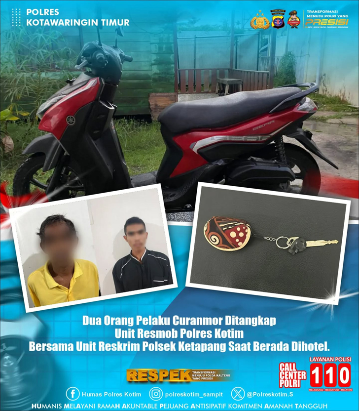 SAMPIT || Journalistpolice.com – Unit Resmob Satreskrim Polres Kotawaringin Timur bersama Unit Reskrim Polsek Ketapang berhasil mengungkap kasus pencurian kendaraan bermotor (curanmor) dan menangkap dua pelaku saat berada di sebuah hotel di Sampit.