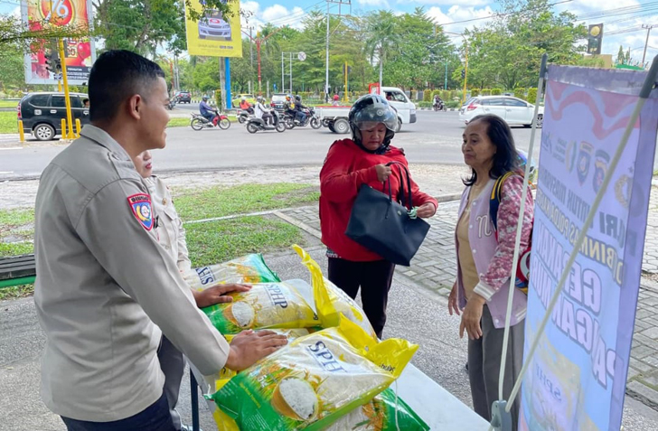 Seperti saat ini, personel Ditbinmas Polda Kalteng menjual beras SPHP untuk masyarakat dengan harga Rp 60 ribu per 5 Kg di pertigaan traffic light Jalan Yos Sudarso-Jalan MH. Thamrin Kota Palangka Raya, Kamis (2/10/2025) siang.