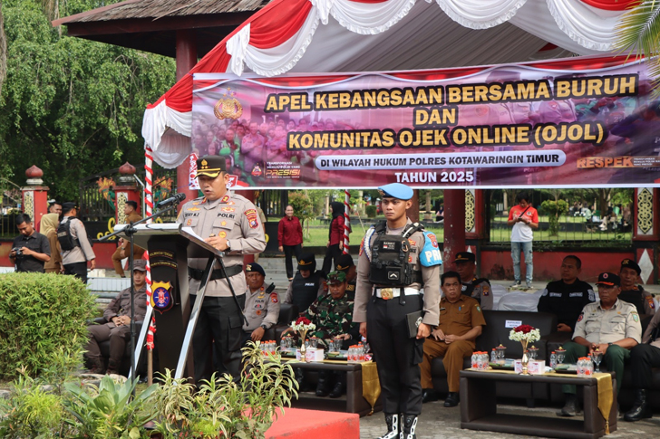 SAMPIT – KALTENG  || Journalistpolice.com – Kapolres Kotim AKBP Resky Maulana Zulkarnain, S.H., S.I.K., M.H memimpin apel kebangsaan bersama buruh dan komunitas ojol di Taman Kota Sampit.