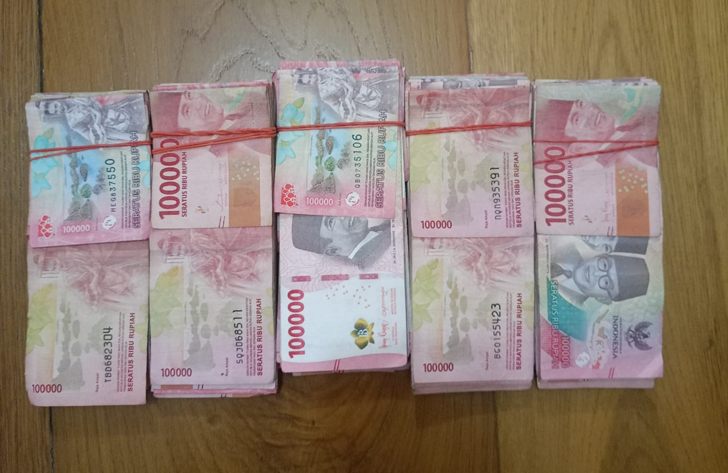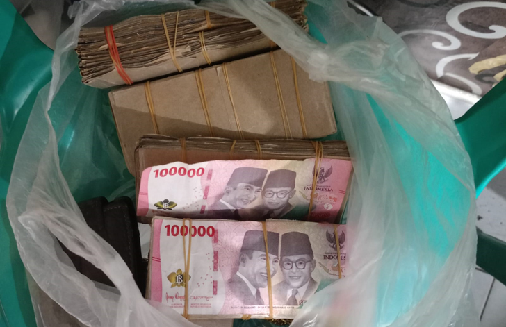 Kemudian, uang tunai Rp48 juta, kemeja lengan pendek warna abu-abu kombinasi biru, celana Jeans panjang merek Lea warna biru, potongan kertas nasi yang dibentuk menyerupai uang dan pada sisi atas dilapis pelaku dengan uang pecahan Rp100 ribu.