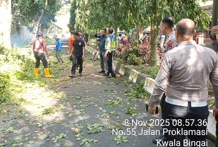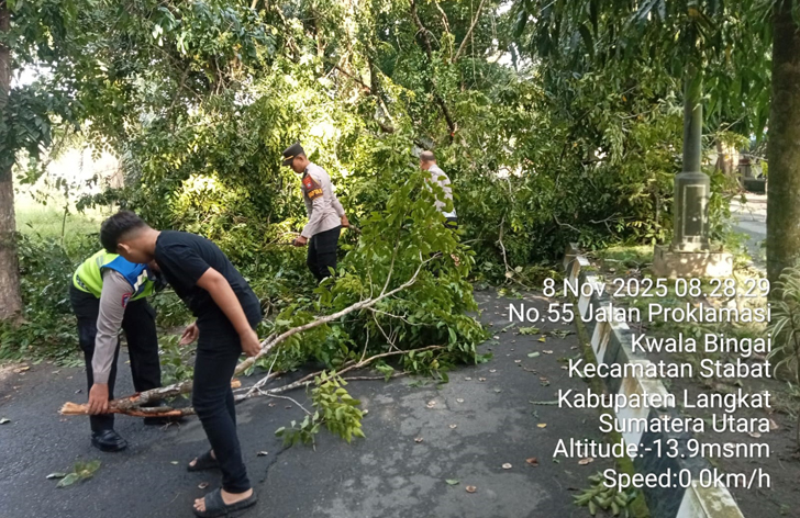 LANGKAT – SUMUT || Journalistpolice.com – Petugas gabungan dari Satlantas Polres Langkat bersama Dinas Lingkungan Hidup (DLH) dan Badan Penanggulangan Bencana Daerah (BPBD) Kabupaten Langkat melaksanakan kegiatan pembersihan pohon tumbang di Jalan Tengku Umar, Kelurahan Kwala Bingai, Kecamatan Stabat, Sabtu (8/11/2025) pagi.