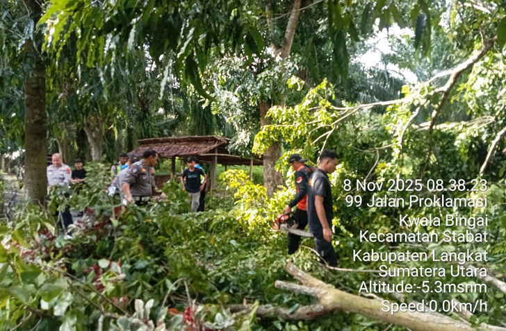 LANGKAT – SUMUT || Journalistpolice.com – Petugas gabungan dari Satlantas Polres Langkat bersama Dinas Lingkungan Hidup (DLH) dan Badan Penanggulangan Bencana Daerah (BPBD) Kabupaten Langkat melaksanakan kegiatan pembersihan pohon tumbang di Jalan Tengku Umar, Kelurahan Kwala Bingai, Kecamatan Stabat, Sabtu (8/11/2025) pagi.