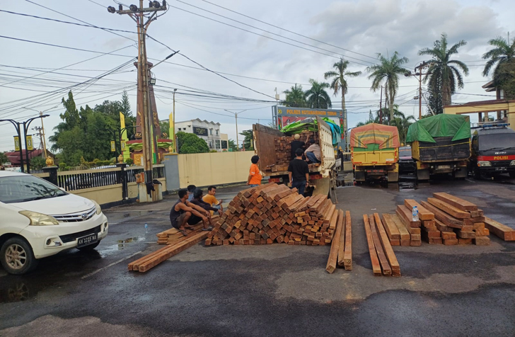 Dengan mengamankan 3 (tiga) orang tersangka berinisial KN,GS, DY. dengan Barang Bukti Kayu panjang 4 m sebanyak 679 pucuk dan panjang 2 m sebanyak 520 pucuk dengan total jumlah sebanyak = 1199 pucuk.