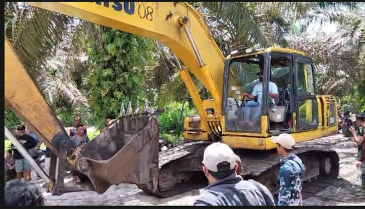 Dengan dikawal aparat penegak hukum PT MAP merusak jalan dengan cara memotong jalan untuk membuat parit besar dengan menggunakan alat berat.