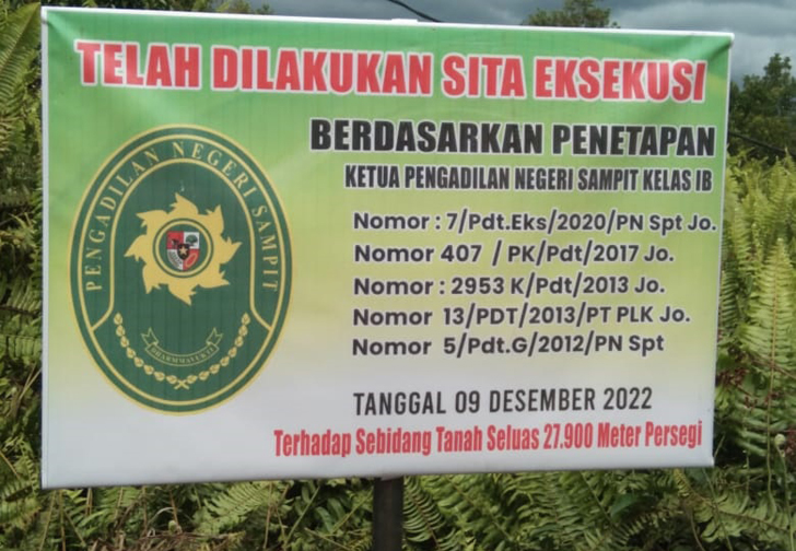 TELAH DILAKUKAN SITA EKSEKUSI BERDASARKAN PENETAPAN KETUA PENGADILAN NEGERI SAMPIT KELAS IB. Nomor: 7/Pdt.Eks/2020/PN Spt Jo, Nomor: 407/PK/Pdt.Eks/2013 Jo, Nomor: 2953 K/Pdt/2013 Jo, Nomor: 13/PDT/2013/PT PLK Jo dan Nomor: 5/Pdt.G/2012/PN Spt, TANGGAL 09 DESEMBER 2022, Terhadap Sebidang Tanah Seluas 27.900 Meter Persegi, dengan dilengkapi Logo Pengadilan Negeri Sampit.