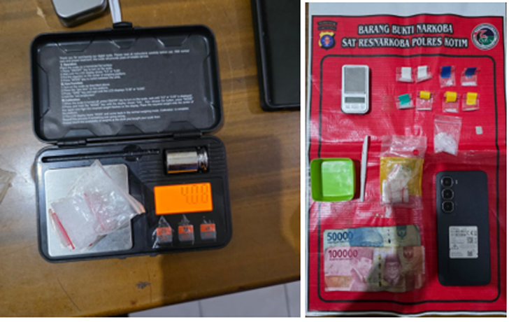 Satu buah timbangan digital, diamankan barbuk Narkotika jenis Sabu dengan berat kotor 4,08 (empat koma nol delapan ) gram dan terlapor mengakui bahwa barang barang tersebut seluruhnya dalam penguasaan terlapor.
