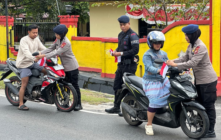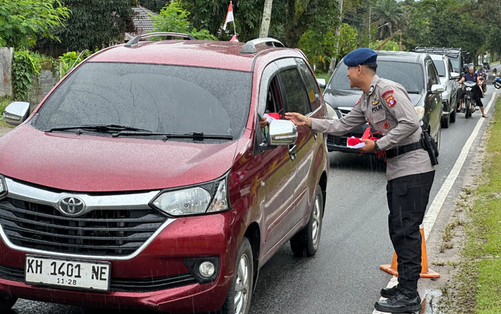 Dengan penuh semangat, Wadansat Brimob bersama anggotanya turun langsung ke jalan untuk membagikan bendera merah putih kepada pengendara sepeda motor maupun mobil, sebagai bentuk nyata penanaman nilai-nilai nasionalisme dan cinta tanah air kepada masyarakat.